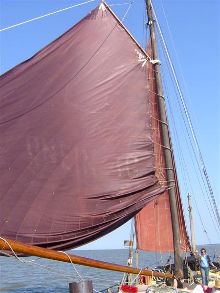 werd. met behulp van de zeillier wordt het grootzeil gehesen. Voor de andere zeilen nemen we nog het touw in de hand. |