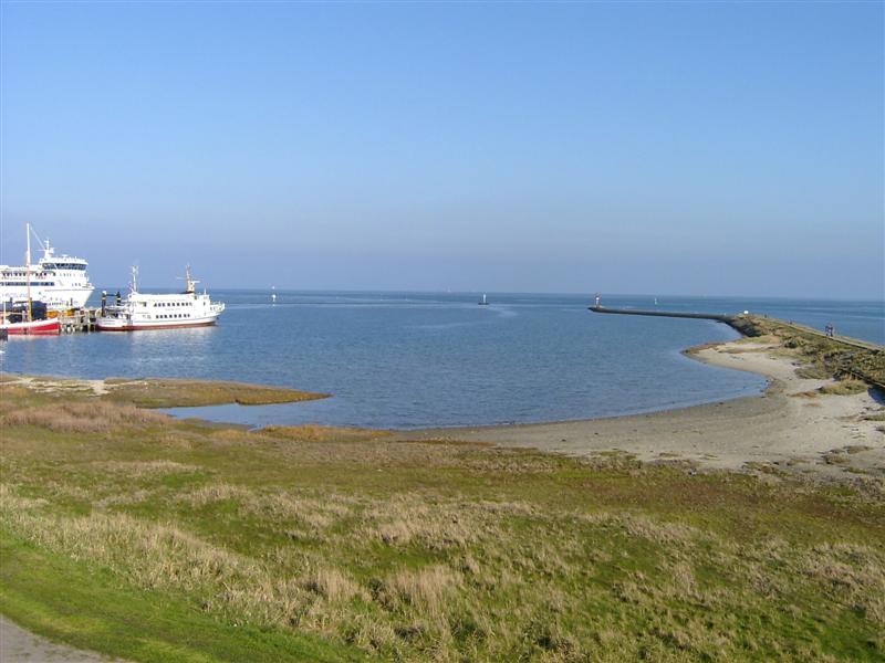 Vlieland ligt direct achter het duin rechts op de foto. Vanuit de haven loopt u zo het strand op. |